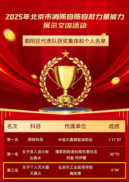 11月上旬,技師學(xué)院教師梅笑寒代表朝陽(yáng)區(qū)參加北京市2025年消防自防自救力量能力展示交流活動(dòng),在“女子個(gè)人滅火器滅真火”項(xiàng)目中榮獲北京市第三名。此次交流活動(dòng),來(lái)自全市20支代表隊(duì)、600名消防安全重點(diǎn)單位、社區(qū)(村)自防自救力量隊(duì)員同場(chǎng)競(jìng)技。
