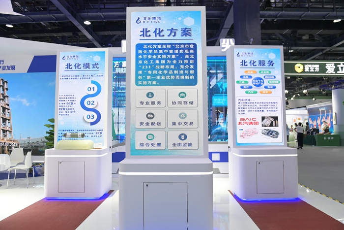 突出展現(xiàn)集團(tuán)發(fā)揮主責(zé)主業(yè)優(yōu)勢(shì),圍繞首都“四個(gè)中心”功能建設(shè),積極融入“五子”聯(lián)動(dòng)新格局取得的豐碩成果,是北京化工集團(tuán)此次參展的一大亮點(diǎn)。“三個(gè)北化”——“北化方案”“北化模式”“北化服務(wù)”展屏矗立其間,構(gòu)筑安全管理全產(chǎn)業(yè)體系、發(fā)展生物醫(yī)藥大健康產(chǎn)業(yè)、服務(wù)首都產(chǎn)業(yè)鏈安全,成為集團(tuán)全新戰(zhàn)略方向和目標(biāo)。